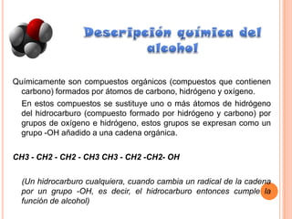 Los alcoholes son compuestos orgánicos formados por carbono, hidrógeno y oxígeno. Contienen un grupo funcional -OH unido a una cadena de carbono, sustituyendo uno o más átomos de hidrógeno de un hidrocarburo. Pueden tener uno o más grupos -OH, determinando si son monol, diol, triol, etc. El carbono al que se une el grupo -OH puede estar unido a un, dos o tres átomos de carbono, siendo primario, secundario o terciario respectivamente.