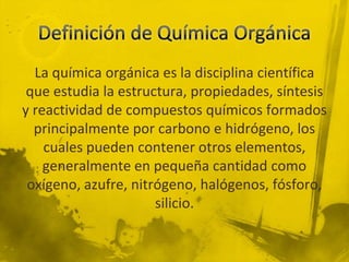 Este documento presenta información sobre la química orgánica e inorgánica. Explica las diferencias entre compuestos orgánicos e inorgánicos, y describe varios tipos de enlaces químicos como enlaces sigma, pi, hibridación sp, sp2 y sp3. También define conceptos como fórmula molecular, estructura molecular y modelo de Lewis.
