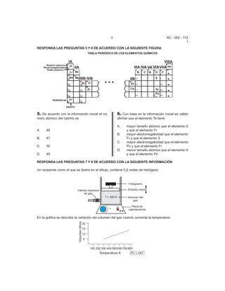 Este documento presenta 16 preguntas de selección múltiple sobre conceptos químicos como puntos de ebullición, reacciones químicas, separación de mezclas, pH y más. Cada pregunta viene acompañada de gráficas, tablas, ecuaciones u otra información relevante para responderla correctamente. El objetivo es evaluar los conocimientos químicos fundamentales de quien resuelva estas preguntas.