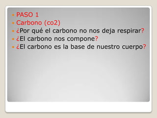 El documento habla sobre el carbono y su función en el cuerpo. Explica que el carbono llega a los alveolos pulmonares para realizar el intercambio de gases y eliminar sustancias, aunque no nos permite respirar directamente. También indica que el carbono se obtiene a través de los alimentos y puede provocar un aumento como residuo del oxígeno, siendo un elemento dañino pero componente de los alimentos.