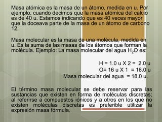 El documento explica las diferencias entre masa atómica, masa molecular y masa fórmula. La masa atómica se refiere a la masa de un átomo individual, la masa molecular es la suma de las masas de los átomos que componen una molécula, y la masa fórmula se usa para compuestos iónicos y se refiere a la masa de la unidad fórmula. También proporciona ejemplos del cálculo de las masas moleculares del etanol y el cloruro de calcio para ilustrar estas