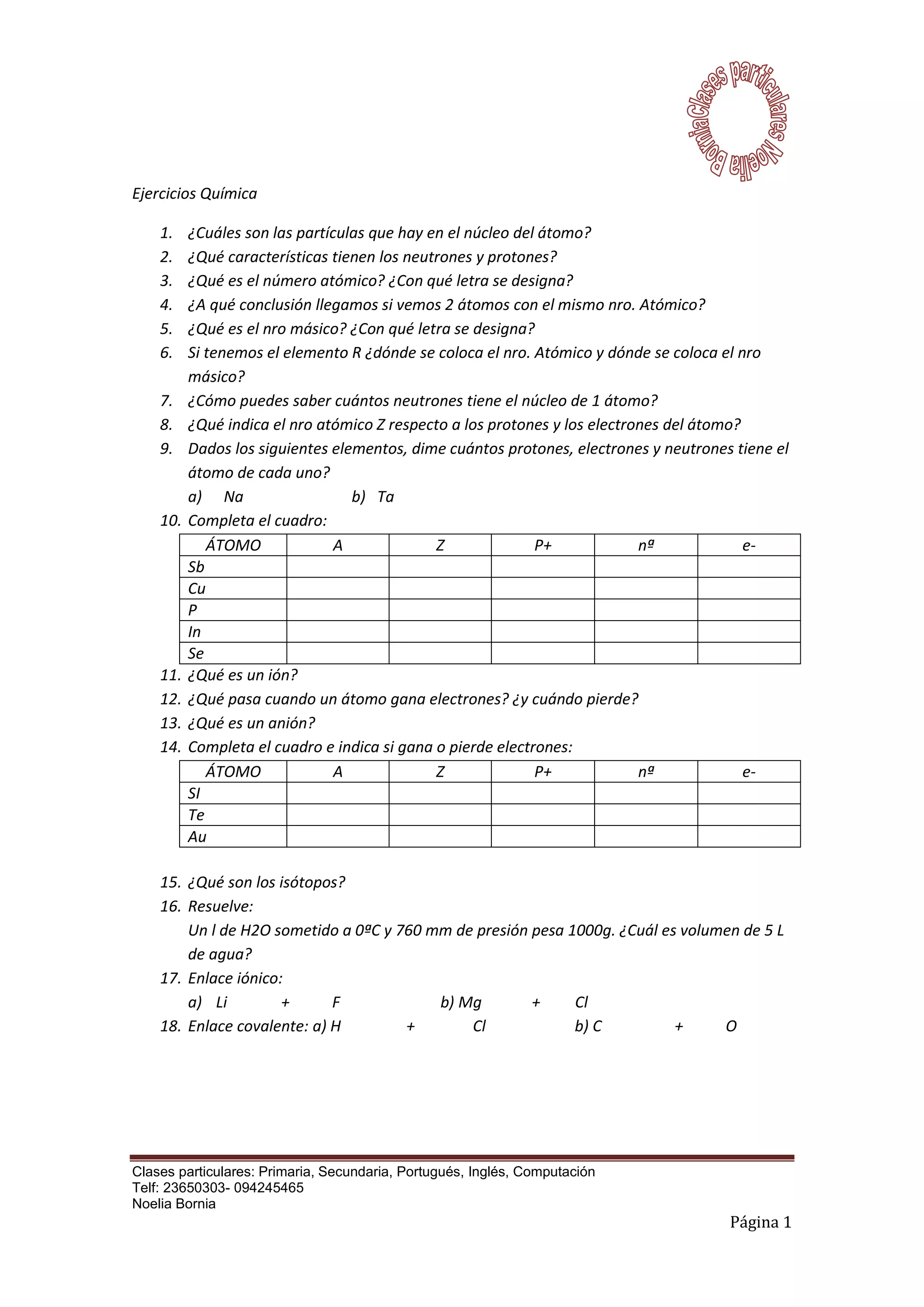 Este documento contiene 17 preguntas sobre conceptos químicos fundamentales como los componentes del núcleo atómico, números atómicos y másicos, carga de protones y electrones, isótopos, enlaces iónicos y covalentes. También incluye ejercicios para determinar la composición atómica de diferentes elementos y calcular el volumen de una cantidad de agua.