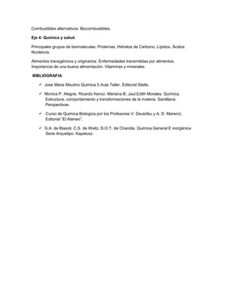 El documento presenta el programa de química para el 5to año de la Escuela de Comercio N° 5076 “Dr Arturo Illia”. Los objetivos generales incluyen promover el acercamiento a la química como disciplina social, propiciar el aprendizaje de conceptos químicos, y generar situaciones para resolver problemas cotidianos relacionados con la química. El programa se divide en cuatro ejes: estructura de la materia, transformaciones de la materia, recursos inorgánicos y orgánicos, y química y sal