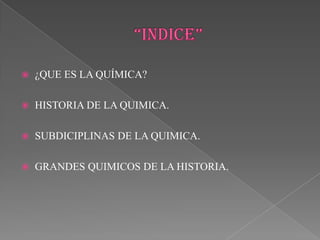 La química es la ciencia que estudia la composición, estructura y propiedades de la materia, así como los cambios que experimenta durante las reacciones químicas. Se divide en subdisciplinas como la química inorgánica, orgánica, bioquímica, físico-química y analítica. La química moderna evolucionó de la alquimia tras la Revolución Química en el siglo XVIII. Algunos grandes químicos históricos incluyen a Lavoisier, Einstein, R