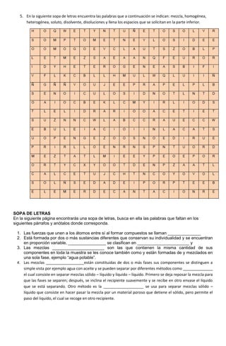 Este documento presenta un trabajo sobre mezclas químicas para el 9° grado. Contiene 9 preguntas que evalúan conceptos como mezclas homogéneas, heterogéneas, solubilidad, y ejemplos de cada tipo de mezcla. Los estudiantes deben completar actividades como mapas conceptuales, identificar ejemplos, y determinar si enunciados son verdaderos o falsos. El objetivo es que los estudiantes comprendan la diferencia entre mezclas homogéneas y heterogéneas.