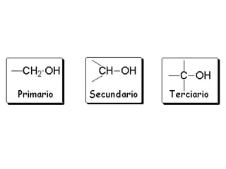 La función química del alcohol se caracteriza por la presencia del grupo funcional hidroxilo (OH), el cual se une a un átomo de carbono en sustitución de un átomo de hidrógeno. Los alcoholes más simples incluyen el metanol, etanol, propanol y butanol. Pueden ser primarios, secundarios o terciarios dependiendo de cuántos átomos de carbono estén unidos al carbono con el grupo OH. Algunos alcoholes comunes son el etanol, usado como combustible, y el metanol, el cual es venenos