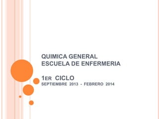 Este documento presenta información sobre química general para una escuela de enfermería. Explica conceptos fundamentales como los estados de la materia (sólido, líquido, gaseoso y plasmático), compuestos químicos, mezclas, leyes ponderales, elementos químicos, fórmulas químicas, compuestos inorgánicos y orgánicos, grupos y períodos de la tabla periódica, valencia y número de oxidación. También incluye ejemplos de óxidos básicos y ácid