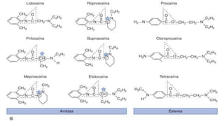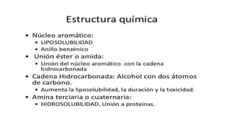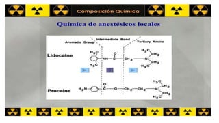 Este documento trata sobre anestesia local. Revisa la historia, estructura química y clasificación de los anestésicos locales, así como su mecanismo de acción, farmacocinética, toxicidad e indicaciones clínicas. Además, describe las técnicas de anestesia local en odontología.