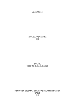 Este documento presenta información sobre compuestos químicos aromáticos. Explica las propiedades y tipos de hidrocarburos aromáticos como el benceno y derivados. Incluye la nomenclatura de compuestos aromáticos monosustituidos, disustituidos y polisustituidos. Finalmente, proporciona ejemplos para nombrar compuestos aromáticos a partir de su fórmula o viceversa.