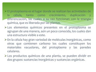 Este documento describe la química del citoplasma en las células vegetales. Explica que el citoplasma contiene moléculas inorgánicas y orgánicas que permiten las funciones de la célula como el crecimiento y la duplicación. Las moléculas inorgánicas más abundantes son el agua y las sales minerales, mientras que las orgánicas incluyen carbohidratos, lípidos y proteínas que sirven como estructuras celulares y alimento. Describe los principales tipos de carbohidratos, lípid