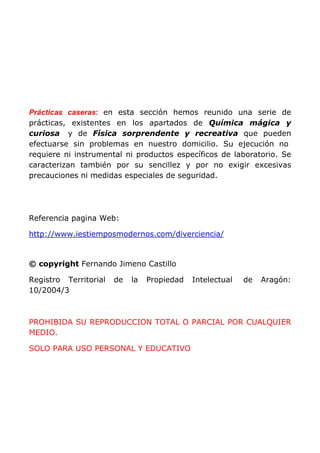 Este documento presenta varios experimentos caseros sencillos de química y física que se pueden realizar en el hogar sin necesidad de equipo de laboratorio especializado. Describe experimentos como bolas de naftalina que suben y bajan en un líquido, cómo "freír" un huevo sin calor usando alcohol, y cómo vaciar el interior de un huevo a través de la ósmosis. También incluye cómo detectar ácidos y bases usando jugo de remolacha y cómo hinchar un globo con la reacción entre bicarbon