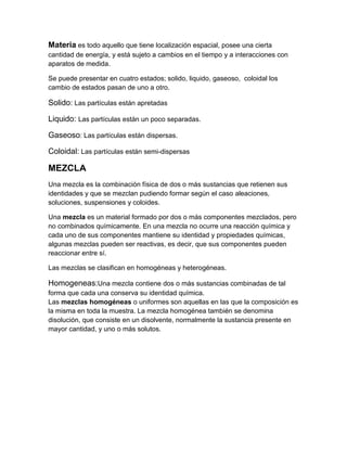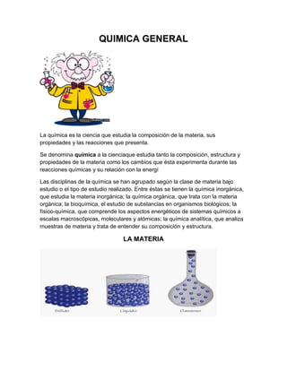 Este documento trata sobre la química general. Explica que la química estudia la composición, propiedades y reacciones de la materia. Describe que la materia puede presentarse en cuatro estados - sólido, líquido, gaseoso y coloidal - y que las mezclas combinan sustancias físicamente sin reacciones químicas. Finalmente, define el átomo como la unidad básica de la materia, formado por protones y neutrones en el núcleo y electrones alrededor.