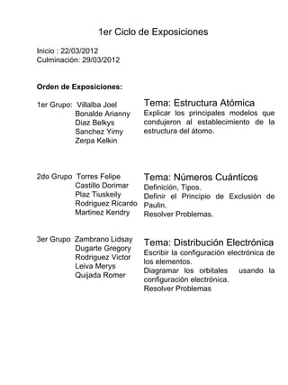 Este documento presenta el orden y temas de 5 grupos de estudiantes que realizarán exposiciones del 22 al 29 de marzo sobre conceptos básicos de estructura atómica, números cuánticos, distribución electrónica, tabla periódica y leyes ponderables. Cada exposición tendrá una duración mínima de 30 minutos y se evaluará el contenido y presentación individual de cada equipo de 2 a 4 estudiantes.