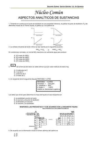 Este documento presenta dos grupos de preguntas de química: 1) Aspectos analíticos de mezclas y sustancias, que incluye conceptos como estructura, composición y propiedades de sustancias y mezclas. 2) Aspectos físico-químicos de mezclas y sustancias, que implica cómo ocurren las reacciones químicas y cómo se afecta el estado de un sistema material dependiendo de sus condiciones. Además, incluye 33 preguntas de química sobre diferentes temas como puntos de e
