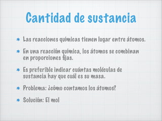 Este documento trata sobre la cantidad de sustancia, las masas atómicas y moleculares, y el mol. Explica que las masas atómicas se establecieron en relación a la masa del átomo de hidrógeno, y que el número de Avogadro indica el número de partículas elementales en una masa dada de sustancia. También define el mol como la cantidad de sustancia que contiene 6,022x1023 partículas o cuya masa coincide con la masa atómica expresada en gramos.