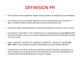Este documento proporciona una introducción al pH y cómo medirlo. Explica que el pH es una medida de la concentración de iones de hidrógeno en una solución, y que valores de pH menores que 7 indican ácidos mientras que valores mayores que 7 indican bases. También describe cómo se puede medir el pH usando un pH-metro o indicadores de pH y proporciona ejemplos del pH de algunas sustancias comunes como la sangre, la leche y el zumo de limón.