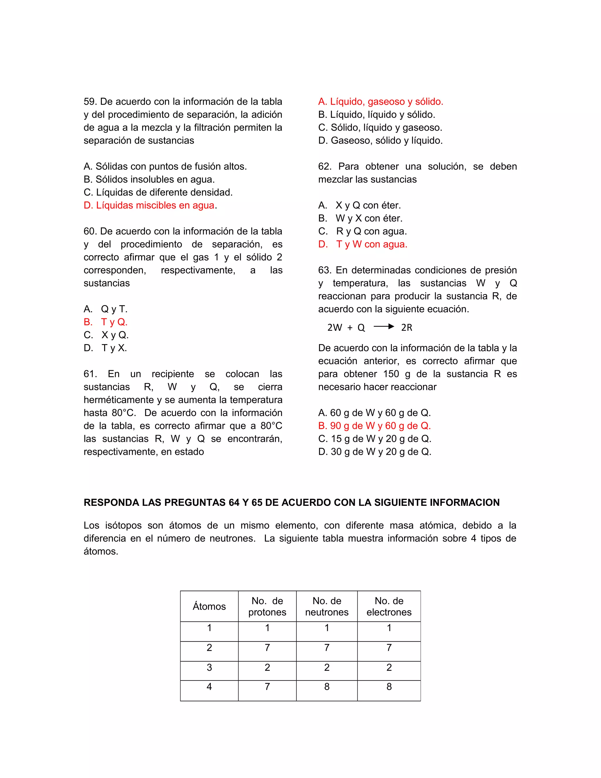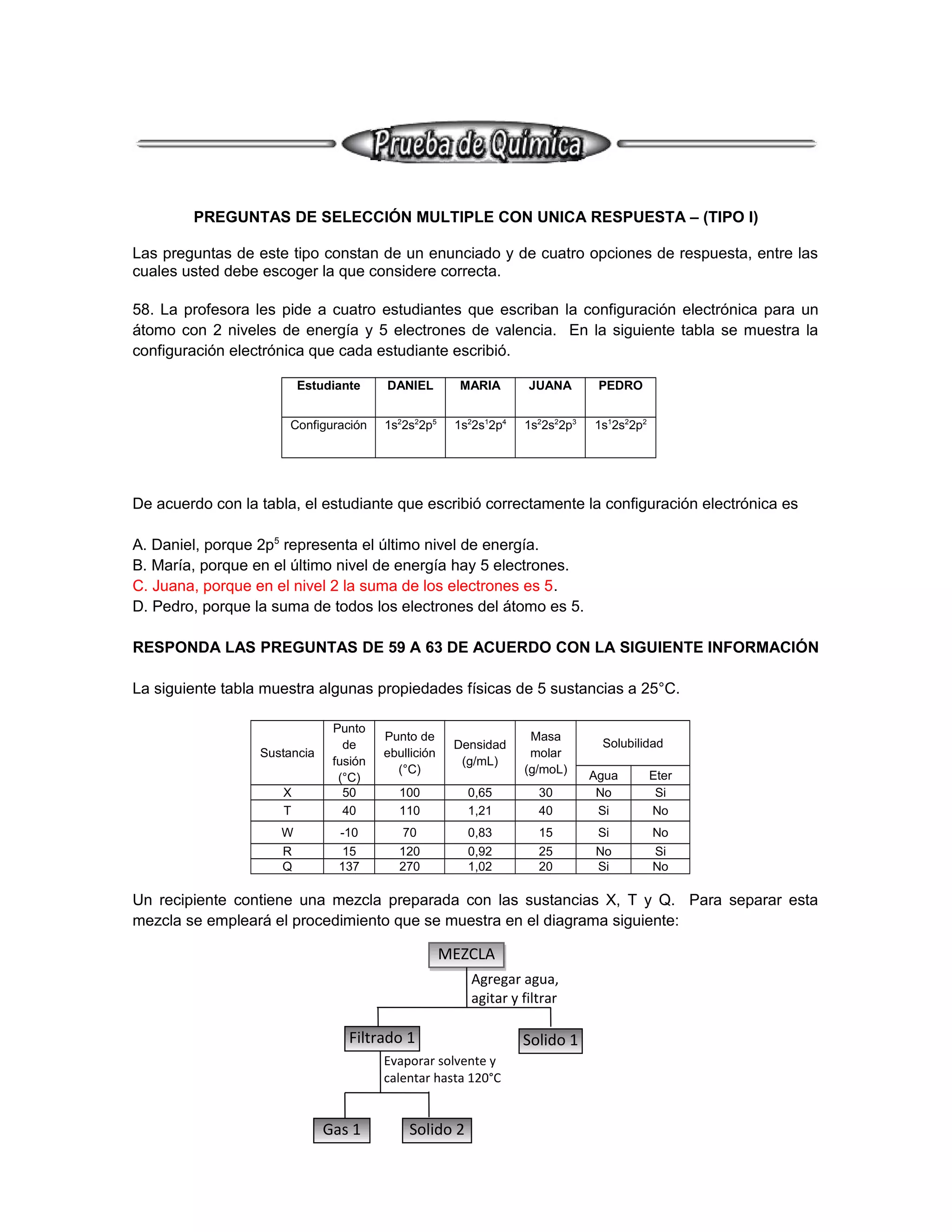 Este documento presenta preguntas de selección múltiple sobre diferentes temas de química y física, incluyendo configuraciones electrónicas, propiedades físicas de sustancias, reacciones químicas y separación de mezclas. Contiene 81 preguntas con sus respectivas tablas e información para responder.