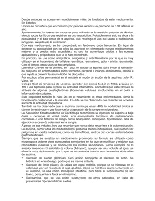 La aspirina se originó a partir de la corteza del sauce, la cual ha sido usada desde la antigüedad para aliviar dolores. En el siglo XIX se aisló el principio activo de la corteza, el ácido salicílico. En 1898, el químico Felix Hoffmann sintetizó el ácido acetil salicílico, más conocido como aspirina, el cual es menos irritante para el estómago que el ácido salicílico. La aspirina se ha convertido en uno de los medicamentos más consumidos debido a que alivia