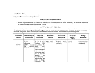 Este documento presenta información sobre la gestión ambiental en el manejo de residuos electrónicos generados en el mantenimiento de computadores. Incluye una matriz que describe los componentes, materiales reciclables y sustancias peligrosas de diferentes residuos electrónicos. También incluye una tabla para completar información sobre productos de mantenimiento y sus instrucciones de uso y almacenamiento de acuerdo a normas ambientales. El objetivo es enseñar a los estudiantes a realizar el manejo adecuado de estos residuos y productos de una manera respons