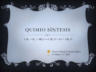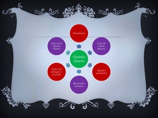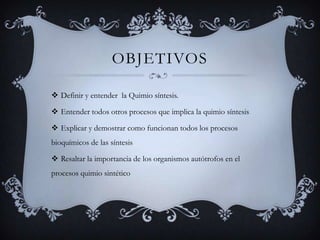 La quimiosíntesis es un proceso mediante el cual los organismos quimiolitótrofos obtienen ATP y fijan dióxido de carbono utilizando compuestos inorgánicos reducidos sin necesidad de luz, similar a ciertas fases de la fotosíntesis. Este proceso se descompone en dos fases: la generación de ATP a través de la oxidación de materiales y la fijación del CO2 mediante el ciclo de Calvin. La quimiosíntesis es fundamental para la obtención de energía en diversas reacciones biológicas en la Tierra.
