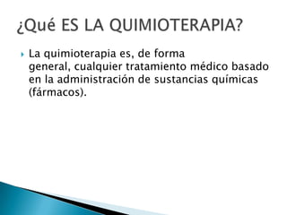 El documento describe los diferentes tipos y métodos de administración de la quimioterapia, así como sus efectos secundarios más comunes. La quimioterapia se basa en la administración de sustancias químicas para tratar el cáncer y puede ser administrada por vía oral, intravenosa o inyectable. Los efectos secundarios más frecuentes incluyen náuseas, caída del cabello, baja en glóbulos blancos y plaquetas, lo que aumenta el riesgo de infecciones y hemorragias.