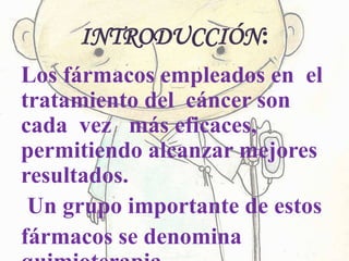 La quimioterapia es un tratamiento para el cáncer que utiliza fármacos para destruir las células cancerosas. Su objetivo puede ser curativo, para eliminar el cáncer, o paliativo, para controlar los síntomas. Los efectos secundarios comunes incluyen náuseas, vómitos, caída del cabello y baja en glóbulos blancos, pero los síntomas generalmente desaparecen una vez finalizado el tratamiento.