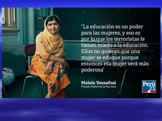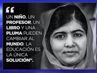 Malala Yousafzai nació en 1997 en Pakistán y se hizo conocida por su lucha a favor de la educación de las niñas y por su activismo contra los talibanes, recibiendo tres disparos por parte de estos en 2012, aunque logró sobrevivir. Actualmente vive en Inglaterra y en 2014 ganó el Premio Nobel de la Paz por su defensa del derecho de las niñas a la educación.