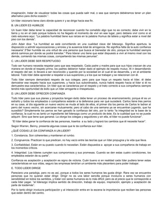 El documento define qué es un líder y describe sus principales cualidades. Un líder es alguien que guía a un grupo hacia un objetivo común de manera voluntaria. Un buen líder debe ser visionario, humilde, respetuoso, generar confianza e innovador. También debe saber dirigir al grupo delegando responsabilidades y tomando decisiones de equipo, no de manera autocrática.