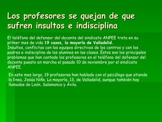 El documento habla sobre los problemas que enfrentan los profesores en Castilla y León, España. En el primer mes de operación, el teléfono del defensor del docente recibió 19 llamadas reportando principalmente insultos, conflictos con directivos y padres, e indisciplina de estudiantes. Los problemas ocurren más en secundaria y incluyen insultos e intimidación de estudiantes hacia profesores. En total, 134 profesores en la región han llamado en busca de ayuda por acoso en los últimos dos años.