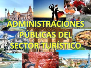 El documento describe las diferentes administraciones públicas y privadas que regulan la actividad turística en España, Andalucía y Sevilla a diferentes niveles - estatal, autonómico y local. A nivel estatal, el Ministerio de Industria, Energía y Turismo y la Secretaría de Estado de Turismo regulan el turismo. A nivel autonómico, la Consejería de Turismo y Comercio de Andalucía y Turismo Andaluz S.A. regulan el turismo en la región. A nivel local, la Diput