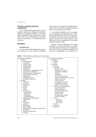Este documento trata sobre las intoxicaciones por alimentos, plantas y setas. Explica que la intoxicación alimentaria se define como aquella causada por cualquier alimento o producto alimenticio que contenga sustancias tóxicas, gérmenes u otros agentes que provoquen una intoxicación. Describe el botulismo como un ejemplo importante, causado por la bacteria Clostridium botulinum y caracterizado por una parálisis muscular. También menciona otras intoxicaciones como las provocadas por el consumo de pescado, mariscos, plantas y hongos t