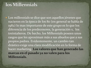 Este documento discute las características y perspectivas de los millennials. Argumenta que los millennials son más diversos de lo que muchas marcas creen y que aunque disfrutan de los medios sociales y dispositivos móviles, también responden al marketing tradicional y les importan los valores de las marcas.