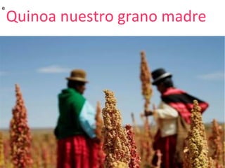 El documento destaca la quinoa como un alimento fundamental, refiriéndose a ella como 'nuestro grano madre'. Se presenta en un formato tabular con filas y columnas, aunque el contenido específico no se detalla en el extracto proporcionado. La repetición del término sugiere una fuerte énfasis en sus características y beneficios.