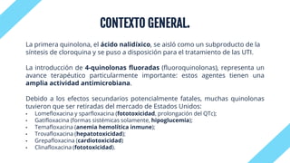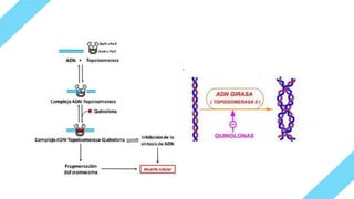Las quinolonas, incluyendo las fluoroquinolonas, son antibióticos con un amplio espectro antimicrobiano, pero varias han sido retiradas del mercado debido a efectos secundarios graves. Se clasifican en generaciones, siendo las primeras menos efectivas y las posteriores más adecuadas para distintos tipos de bacterias. Su mecanismo de acción se basa en la inhibición de la síntesis de DNA bacteriano, y su uso requiere precauciones en casos de interacciones medicamentosas y efectos adversos.