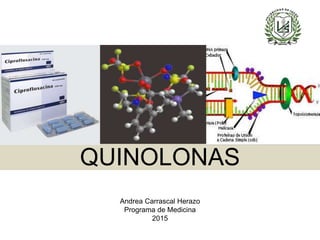 Las quinolonas son antibióticos que actúan interrumpiendo la replicación del ADN bacteriano al bloquear la ADN girasa bacteriana. Se clasifican en varias generaciones según su espectro de acción y vía de administración, desde la primera generación con acción limitada hasta la cuarta con mejor acción contra anaerobios. Tienen estructura química formada por dos anillos con nitrógeno y carbonilo que les confi