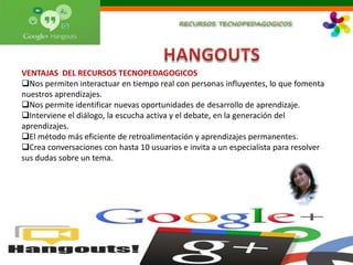 Los recursos tecnopedagógicos permiten la interacción en tiempo real con personas influyentes para fomentar el aprendizaje, identificar nuevas oportunidades de desarrollo, e intervenir el diálogo, la escucha activa y el debate para generar aprendizajes. Además, estos recursos ofrecen una retroalimentación eficiente y aprendizajes permanentes mediante conversaciones con múltiples usuarios e invitados especializados.