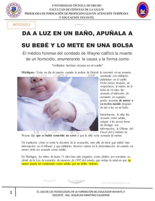 El documento presenta varios artículos relacionados con la educación infantil. El primer artículo informa que 11 bebés fueron abandonados en las calles de La Paz en lo que va del año. El segundo artículo detalla el caso de una adolescente de 16 años que dio a luz en un baño, apuñaló a su recién nacido y lo puso en una bolsa. El tercer artículo ofrece consejos y juegos para fomentar la autoestima en el aula, como realizar asambleas para hablar sobre emociones y reconoc