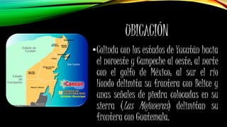 El documento proporciona información sobre el estado mexicano de Quintana Roo, incluyendo sus límites geográficos, clima tropical, hidrografía con ríos como el Hondo y Azul, relieve plano, flora y fauna características, cultura maya, y principales atracciones turísticas como la Riviera Maya, sitios arqueológicos como Tulum y Cobá, y destinos como Isla Mujeres.