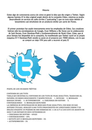 Twitter es un servicio de microblogging con sede en San Francisco que permite enviar mensajes de texto de hasta 140 caracteres llamados tweets. Fue creado por Jack Dorsey en 2006 y ha ganado popularidad mundial con más de 500 millones de usuarios que publican 65 millones de tweets diariamente. Los usuarios pueden seguir otras cuentas y hacer que sus tweets aparezcan en la línea de tiempo de sus seguidores.