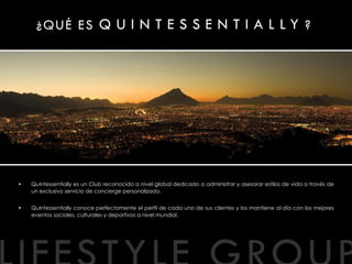 Quintessentially es un club global que ofrece servicios de concierge personalizado, brindando a sus miembros acceso a eventos exclusivos y atención a medida a través de account managers personales. Con oficinas en todo el mundo, proporciona soluciones a diversas solicitudes, desde reservaciones hasta viajes complejos, manteniendo un enfoque en la personalización y el servicio proactivo. Las membresías varían en niveles y precios, garantizando beneficios únicos y acceso a información privilegiada.