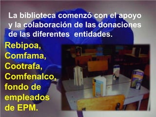 La biblioteca comenzó con donaciones de diferentes entidades. A pesar de carecer de recursos tecnológicos adecuados, se realizaron actividades sencillas que permitieron organizar la biblioteca en términos de infraestructura y técnica. Finalmente, se celebró una ceremonia de inauguración con la comunidad para la apertura de la biblioteca, fruto de la colaboración de un equipo de trabajo.