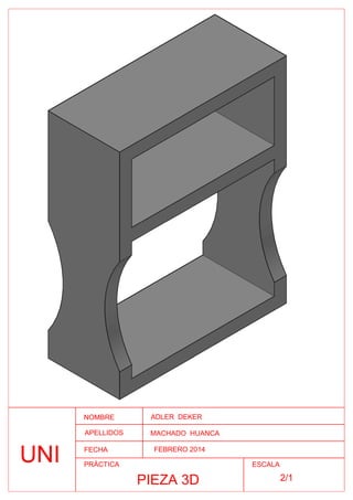 Un documento contiene el nombre y apellidos de dos personas, la universidad a la que asisten, la fecha de febrero de 2014 y se refiere a una pieza 3D impresa a escala 2/1.