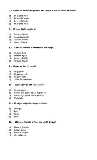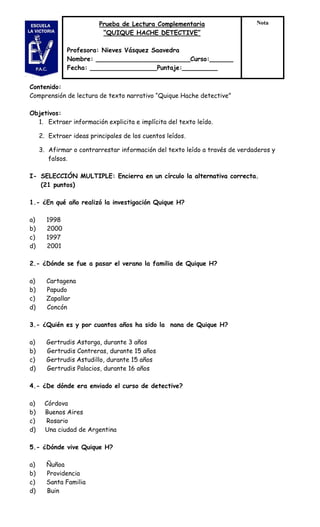 Este documento presenta un resumen de comprensión de lectura del cuento "Quique Hache detective". Los objetivos son extraer información explícita e implícita del texto, identificar las ideas principales y afirmar u oponerse a la información a través de verdaderos y falsos. Contiene 21 preguntas de selección múltiple y 14 afirmaciones para clasificar como verdaderas o falsas sobre el cuento.