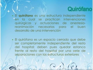 El documento describe las características de la zona blanca del quirófano, incluyendo su tamaño, puertas, paredes, piso, ventilación, temperatura, iluminación y equipos. También describe la ropa quirúrgica, instrumental y preparación del campo estéril.