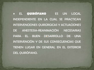 El documento describe las características de un quirófano, incluyendo que es un local independiente donde se realizan intervenciones quirúrgicas y actuaciones de anestesia-reanimación. Debe estar aislado del resto del hospital y tener relaciones con servicios como urgencias y laboratorios. Existe controversia sobre su ubicación ideal en los hospitales. Su diseño debe permitir la circulación de personal y equipos al tiempo que aísla las heridas y previene la transmisión de enfermedades.