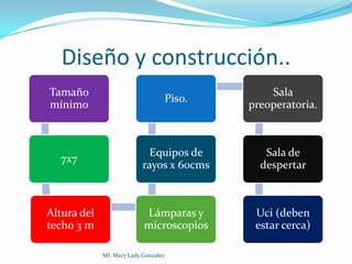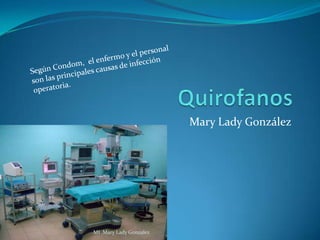 El documento describe las medidas de control de infecciones para una sala de operaciones quirúrgicas, incluyendo mantener una temperatura y humedad adecuadas, ventilación con aire ultra limpio y flujo laminar, uso de filtros, limpieza regular, luz ultravioleta, ropa y protectores quirúrgicos impermeables, lavado de manos con cepillos y desinfectantes, y preparación del paciente con lavado y desinfección de la zona quirúrgica.