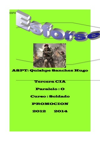 El documento proporciona información sobre Hugo Quishpe Sanchez, un soldado que se graduó de la Tercera Compañía en 2014. También incluye la misión y visión del Instituto de Formación Militar ESFORSE, que busca formar soldados, servicios y especialistas del ejército basados en competencias profesionales y valores como el respeto a los derechos humanos, y convertirse en un instituto de formación militar superior, creíble y líder en la región.