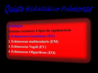 La hidatidosis es causada por el parásito Echinococcus granulosus. Requiere dos huéspedes para completar su ciclo vital: el perro como huésped definitivo y ovejas u otros mamíferos como huéspedes intermediarios. Los huevos son eliminados en las heces de perros y ingeridos por el huésped intermediario, donde forman quistes hidatídicos. En humanos, estos quistes a menudo se localizan en el hígado y pulmones y pueden causar síntomas. El diagnóstico