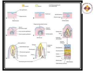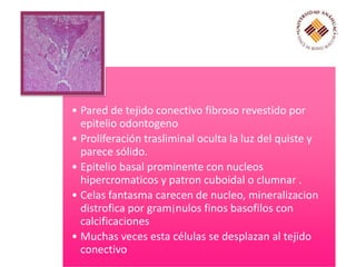 El proceso de odontogénesis o desarrollo dental pasa por varias etapas clave, incluyendo la yema dental, el casquete, la campana y el folículo dentario. Los quistes odontogénicos calcificantes son radiotransparentes y pueden mostrar calcificaciones irregulares dispersas, y se diagnostican diferencialmente de otros tumores dentales. El tratamiento incluye raspado quirúrgico o extirpación.