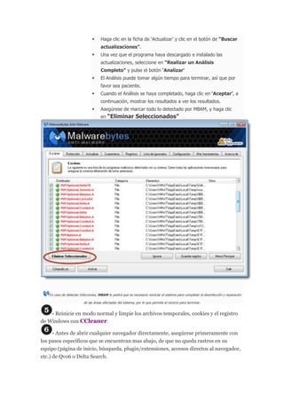 Este documento proporciona instrucciones para eliminar Qvo6 y Delta Search de los navegadores Internet Explorer, Mozilla Firefox y Google Chrome. Describe usar herramientas como CCleaner, AdwCleaner y Malwarebytes Anti-Malware para limpiar el sistema. Luego, detalla pasos como eliminar complementos y extensiones no deseadas, cambiar la página de inicio y motor de búsqueda predeterminado, y borrar entradas relacionadas en el Registro para asegurar que Qvo6 y Delta Search hayan sido completamente removidos.